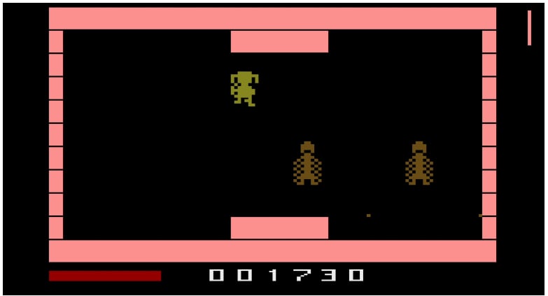Using your joystick, you control Takahiro’s movement in all directions across the arena floor. The fire button launches laser arrows toward incoming enemies, allowing you to strike back and clear the path to victory. Every encounter becomes a test of timing and survival as the arena fills with bouncing energy attacks and advancing fighters.